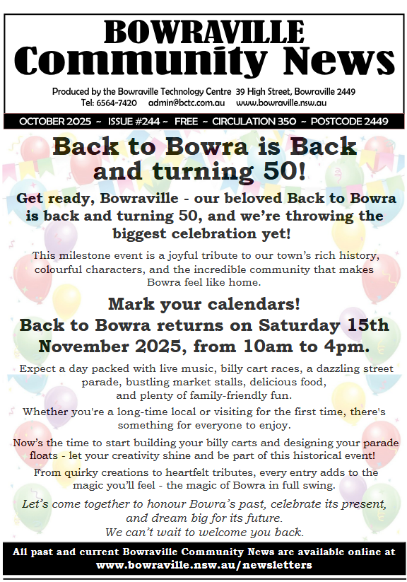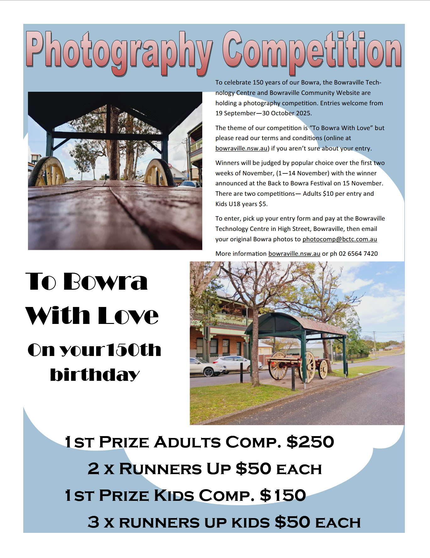 2025 CalendarWith Bowraville turning 150 this year, a lot is happening. Check out this calendar before making other plans for yourself. | Bowraville Technology Centre - High StreetOperating out of Bowraville for the past 40 years, the Bowraville Technology Centre is a not-for--profit organisation who is here to help. We offer printing, laminating, 3D printing, typing, internet service and are an agent for Services Australia. |